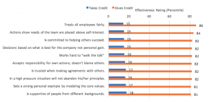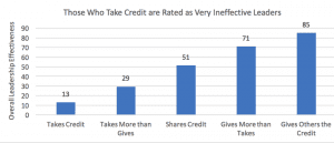 The graph below demonstrates the impact of taking or giving others credit on a leader’s perceived overall effectiveness. Those leaders whose tendency was to take credit were rated as very ineffective leaders (13th percentile), while those who tried hard to give the credit to others were rated as some of the most effective leaders (85th percentile). Overall leadership effectiveness measures the overall effectiveness of a leader on a broad set of behaviors. This data demonstrates the dramatic negative effect of taking credit, along with the positive impact of giving credit to others.